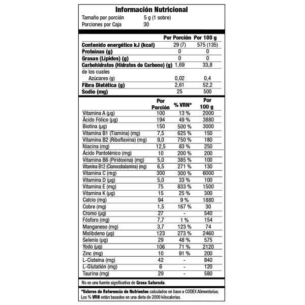 Su combinación de vitaminas A, C, D, E y K, junto con el complejo B (tiamina, riboflavina, niacina, ácido pantoténico, piridoxina, biotina y ácido fólico), proporciona los nutrientes esenciales para el óptimo funcionamiento del organismo.